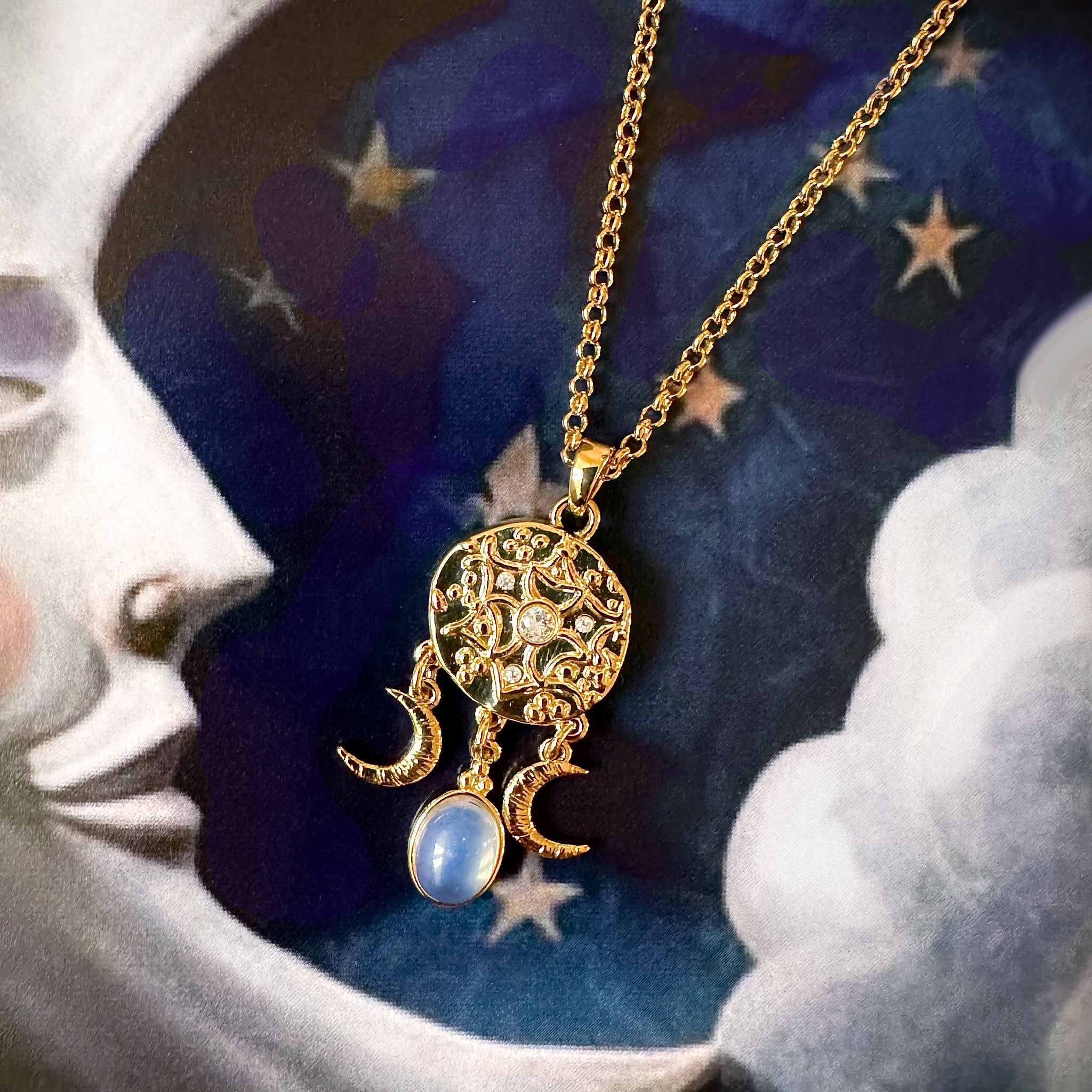 I was picturing the queen of the fae wander the night, her long dress flowing behind her. She comes back to the castle a sunrise, hair wild and looking more mysterious. She has spoken with the moon and seen what is to come. Morgan le Fay is a queen of legend and myth who studied under Merlin and lead her brother Arthur back to Avalon upon his death. A sorceress and a Fae Queen. Our necklace is a talisman of three crescent moons around a center circle stone and dangling below is two crescent moons with a center domed glass that mimics the moon ,as well as you might, say a crystal ball. Brass plated in 18K gold with cubic zirconia stones on a 16" chain with a 3" extension for added length if desired.