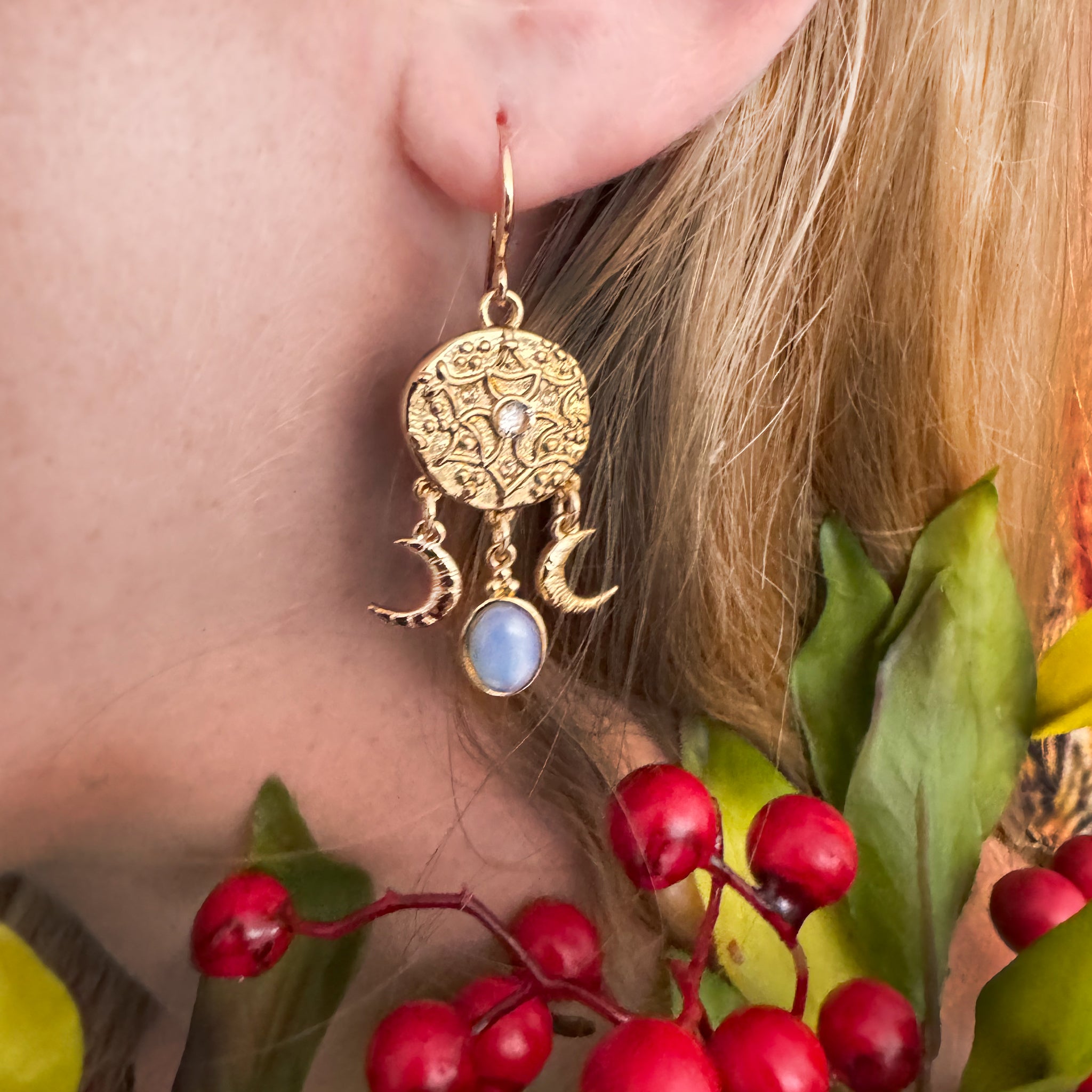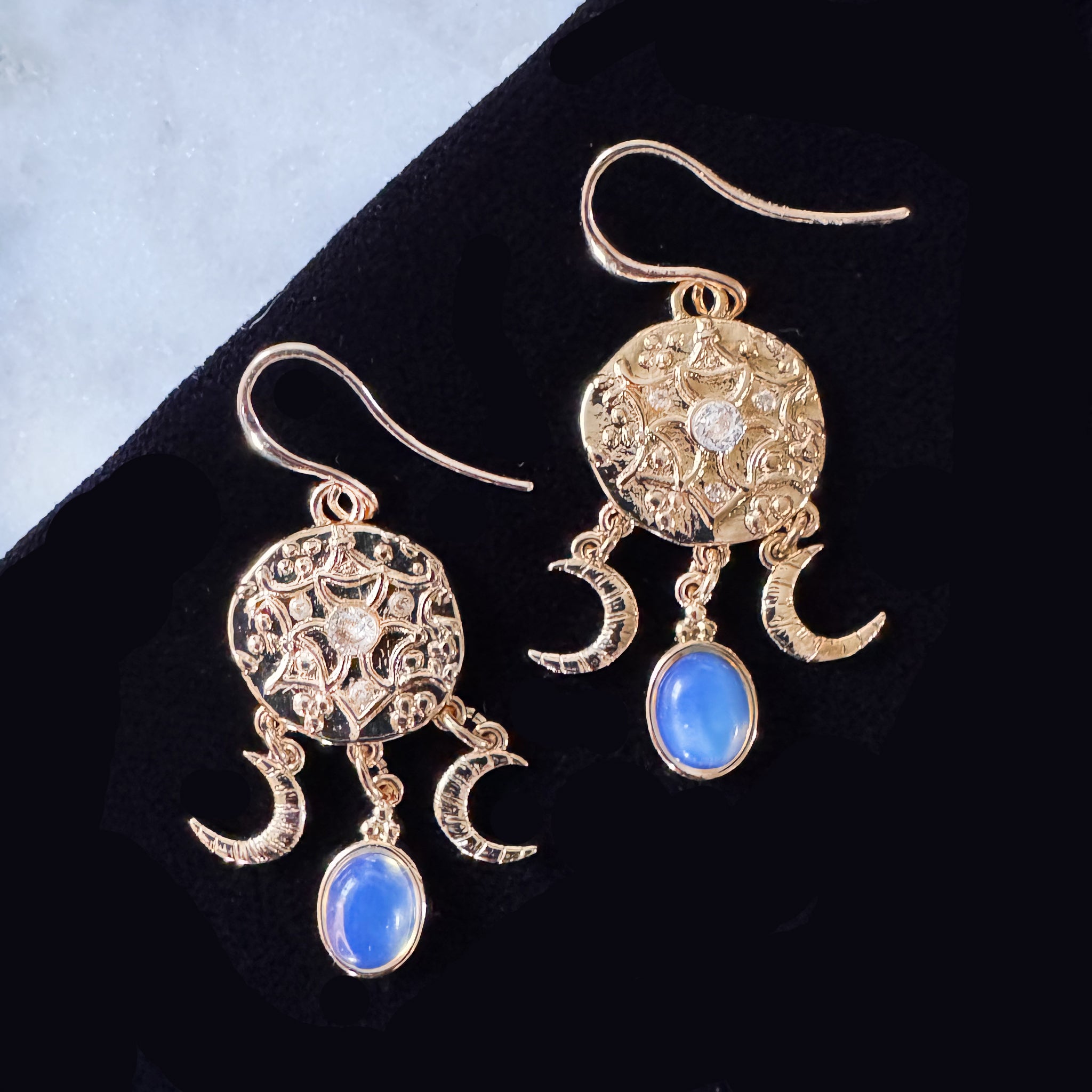 I was picturing the queen of the fae wander the night, her long dress flowing behind her. She comes back to the castle a sunrise, hair wild and looking more mysterious. She has spoken with the moon and seen what is to come. Morgan le Fay is a queen of legend and myth who studied under Merlin and lead her brother Arthur back to Avalon upon his death. A sorceress and a Fae Queen. Our earrings are a talisman of three crescent moons around a center circle stone and dangling below is two crescent moons with a center domed glass that mimics the moon ,as well as you might, say a crystal ball. Brass plated in 18K gold with cubic zirconia stones.