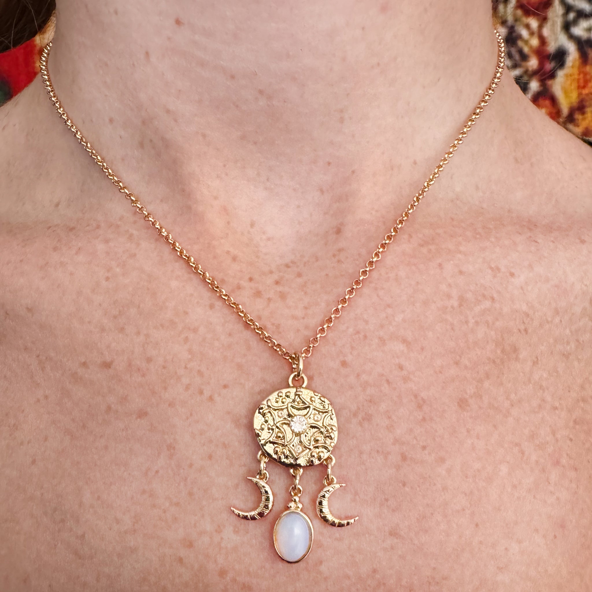 I was picturing the queen of the fae wander the night, her long dress flowing behind her. She comes back to the castle a sunrise, hair wild and looking more mysterious. She has spoken with the moon and seen what is to come. Morgan le Fay is a queen of legend and myth who studied under Merlin and lead her brother Arthur back to Avalon upon his death. A sorceress and a Fae Queen. Our necklace is a talisman of three crescent moons around a center circle stone and dangling below is two crescent moons with a center domed glass that mimics the moon ,as well as you might, say a crystal ball. Brass plated in 18K gold with cubic zirconia stones on a 16" chain with a 3" extension for added length if desired.