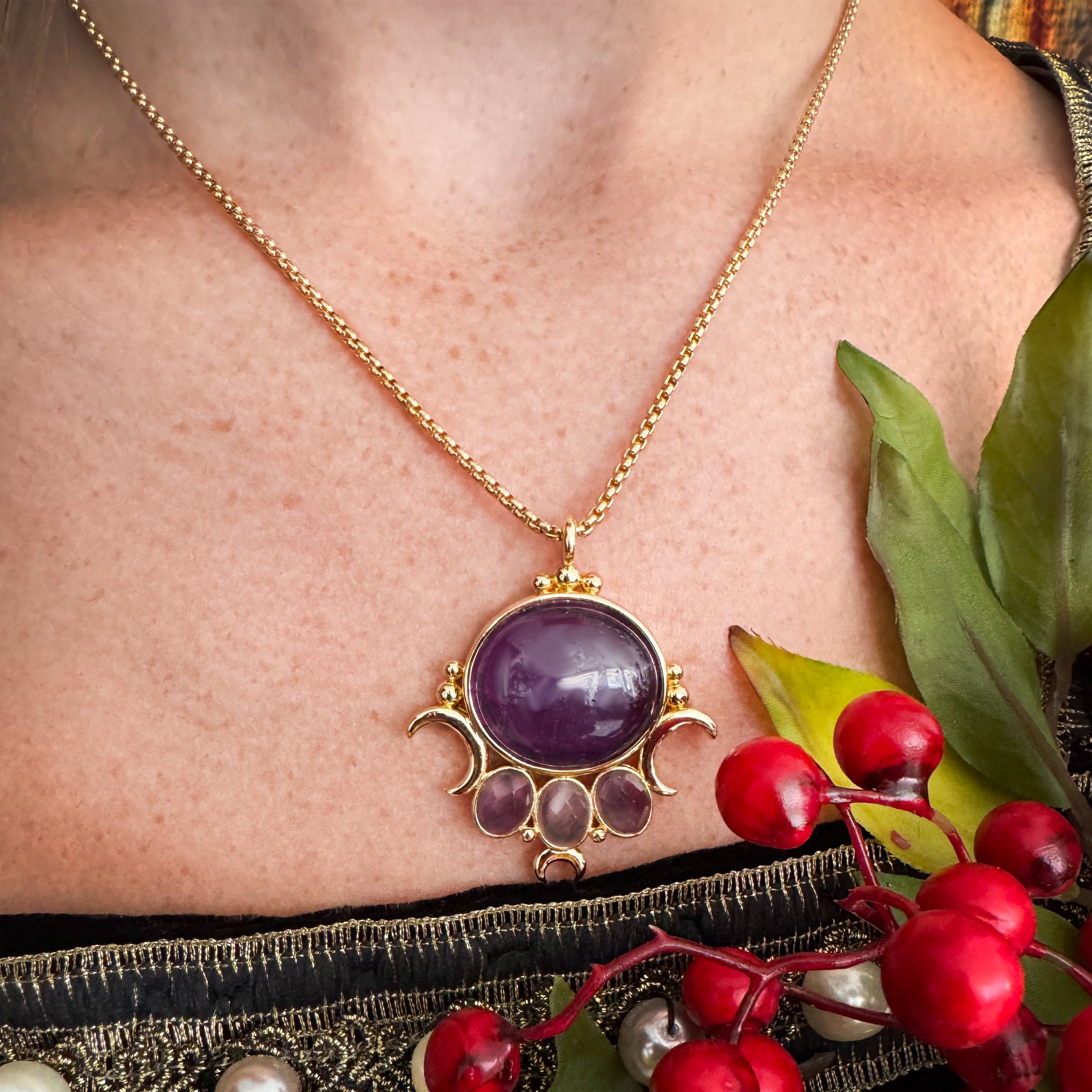 Medusa was a priestess in the temple of Artemis before the madness that lead to her transformation. We pictured what she might look like in those days... A chunky stone worn with her flowing gowns made of Sunstone or Labradorite and Moonstone or Amethyst. Three crescent moons along with three smaller rose cut stones and a large center stone.  Our pendant is on a brass 17" long chain plated in 18K gold with a 3" extension at the closure for additional length if desired.