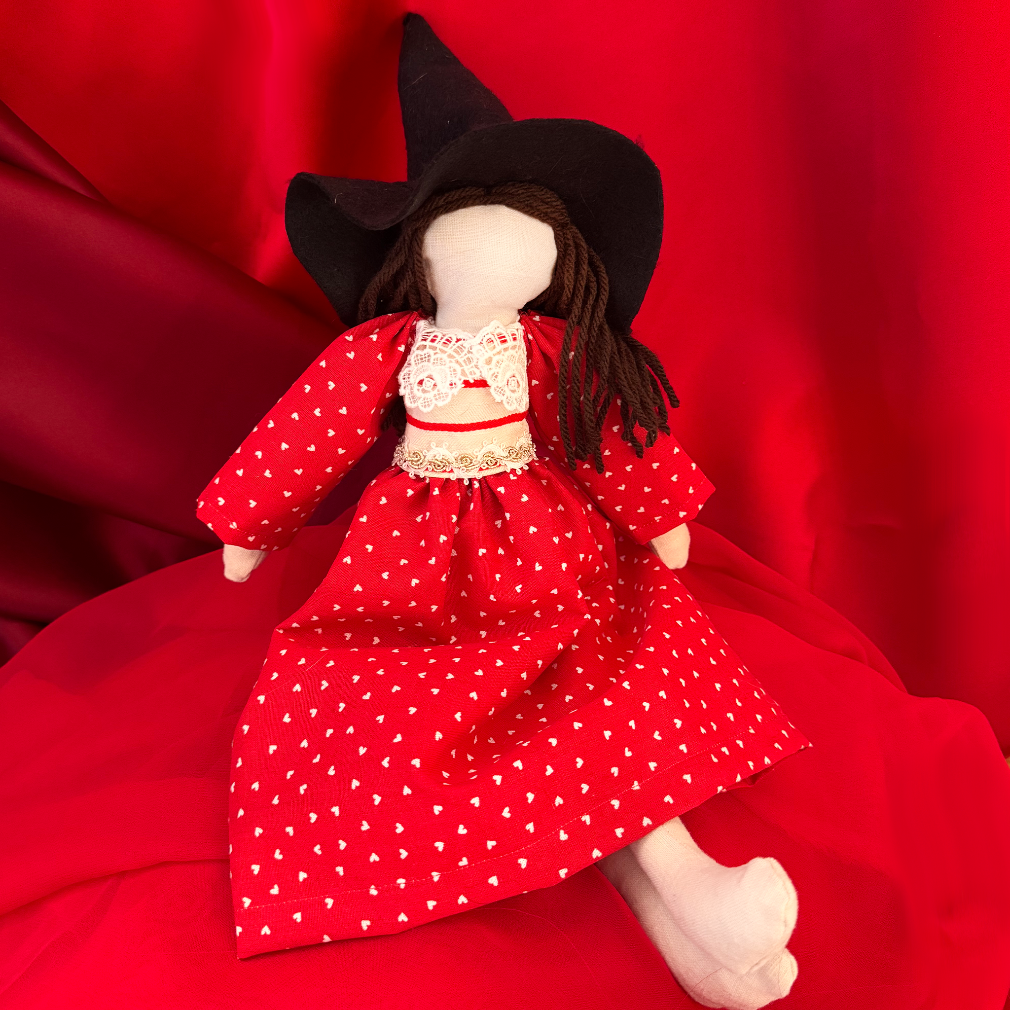 Yeah so? This is a Love Witch. She likes chocolates, long walks and gossiping about boys. She does have a history of light stalking so be careful but she's also excellent at finding the tea. Her dislikes are sporting events and bro culture. She's known for her predictive intuition about relationships and is an excellent match maker. She's hand made and one of a kind. Made of cotton poplin and poly fill body with black felt hat, cotton dress with lace trim and yarn hair. Please do not wash or had to small children. Not that she eats children (anymore) but they might pull off her arms. That would be bad. 17" long approx.