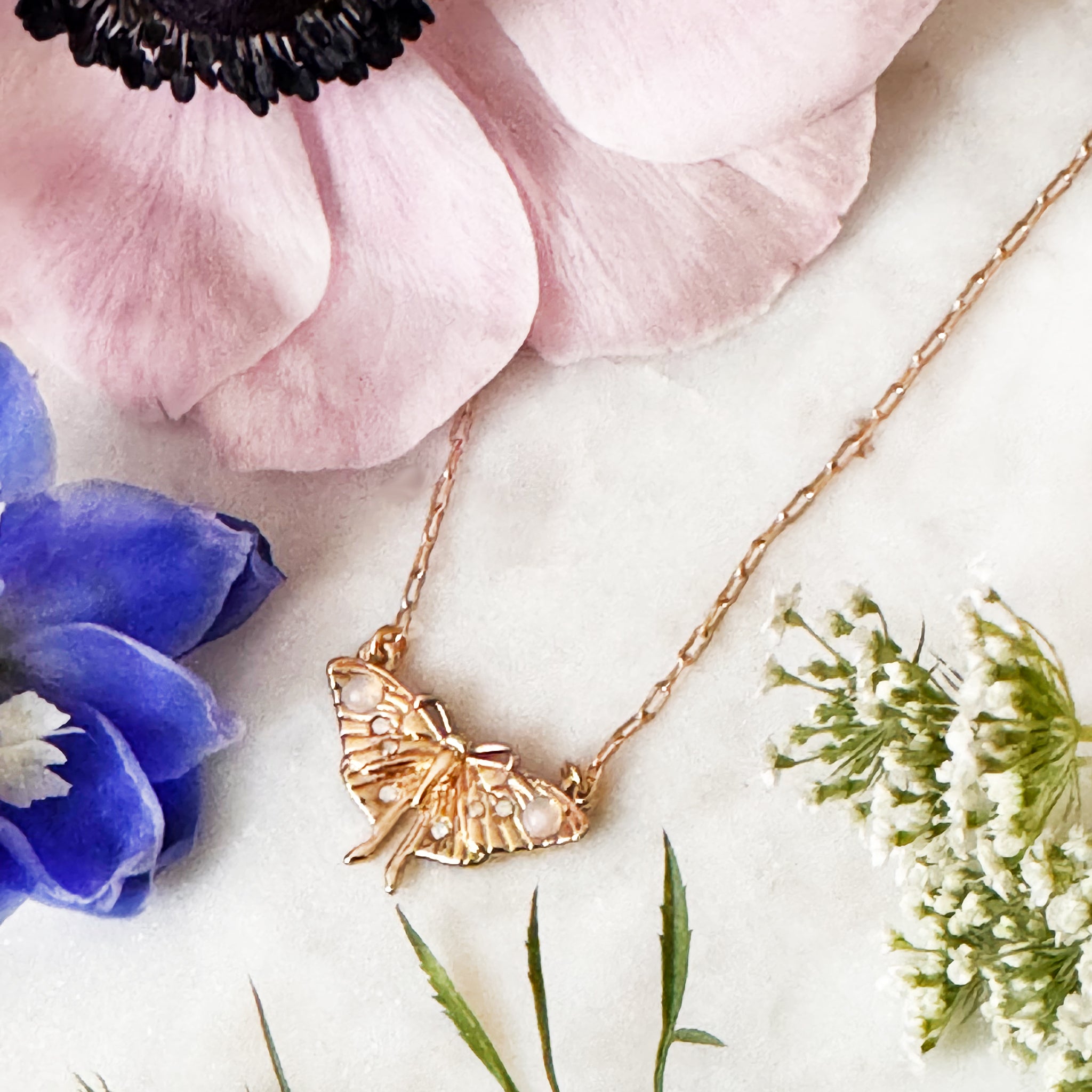 A little Faerie told me she wanted a Moon Moth. Someone to dance with under the stars and the full moon that hangs like a chandelier above. In her moon garden full of white flowers. And so a little moon moth necklace is here with tiny opal stones for when the Fae feel like dancing. Our necklace is 16" long with a 3" extension at the back for additional length. Brass plated in 18K gold or silver.