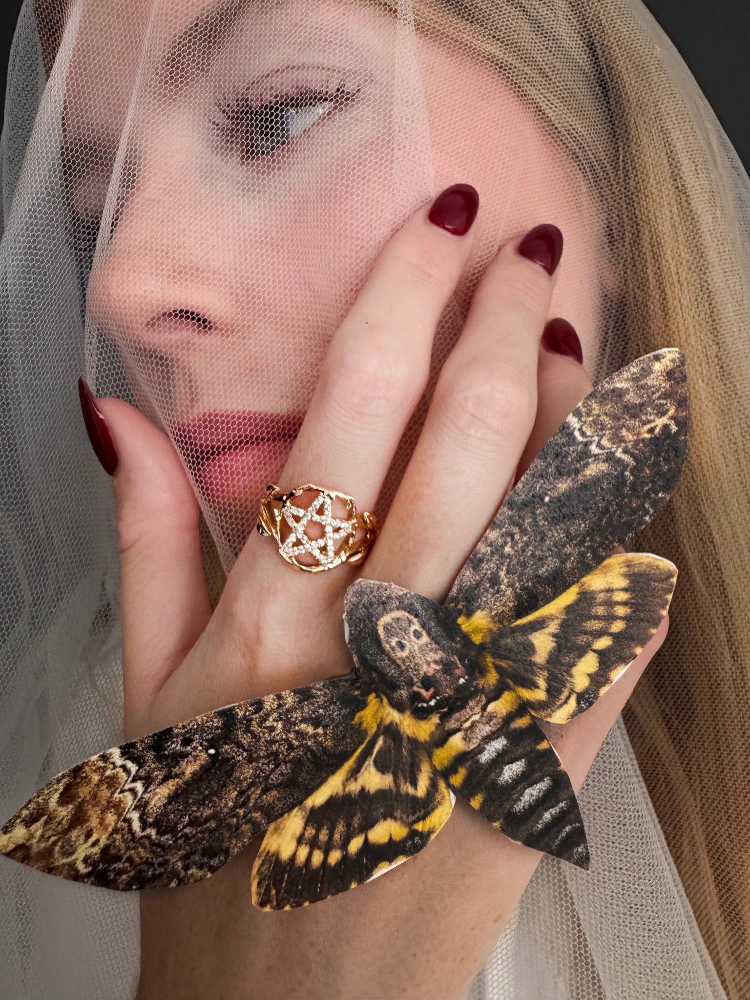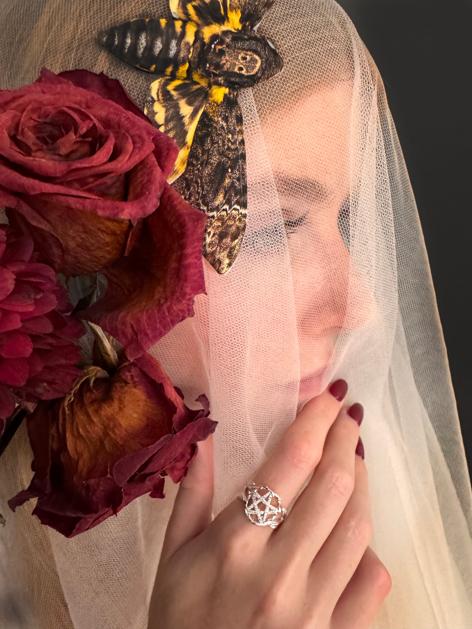 A Hedge Witch is a magical practitioner that rides the boundry between the mundane world and the spirit world, often practicing solo. Historically, they were herbalists who lived on the outskirts of a community, using their knowledge of plants for remedies and providing magical or protective services. In modern terms, the practice emphasizes the liminal spaces and a deep connection with nature, spirit, and intuition. Our ring was created with these nature loving witches in mind. Our delicate pentagram ( a symbol of protection) is a tiny star of cubic zirconia stones and and held in a circle and band that looks like tiny branches. Brass base with 18K gold plating or silver plating. COMING SOON!